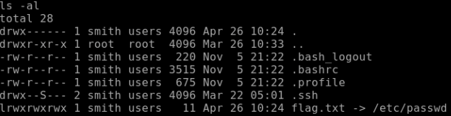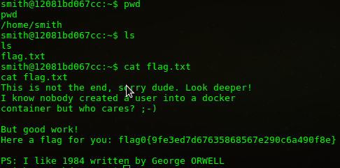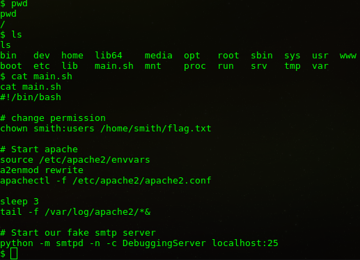 Dizinler arasında geçiş yaparken main.sh dosyasını okuyorum. Görüldüğü gibi smith adında bir kullanıcı var ve ilk flag ordan alınacak. Home dizininden girmeyi deneyelim.