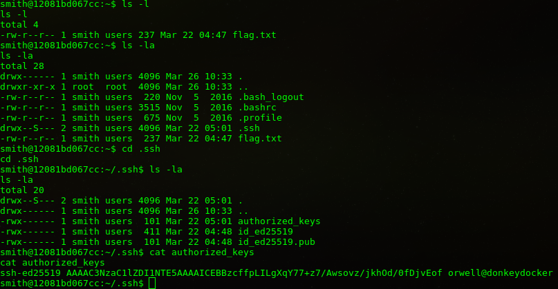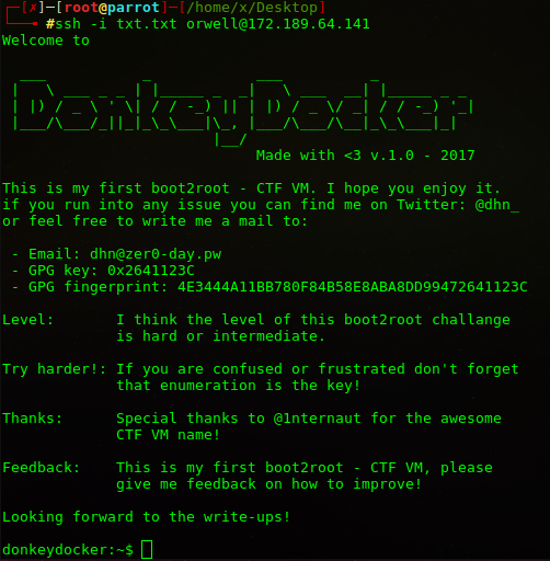 donkeydocker:/home/orwell# id uid=0(root) gid=0(root) groups=0(root) donkeydocker:/home/orwell#