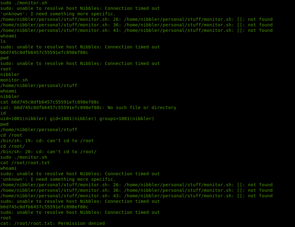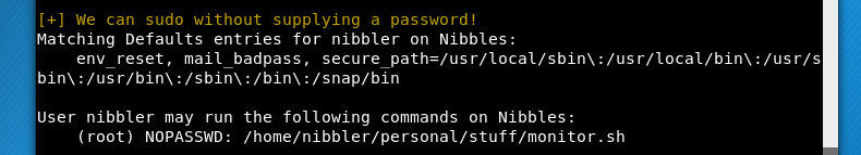 LinEnum script’i ile zayıflıkları ararken, /home/nibbler/personal/stuff/monitor.sh dosyasından parolasız root haklarında komut çalıştırabileceğimi farkediyorum.