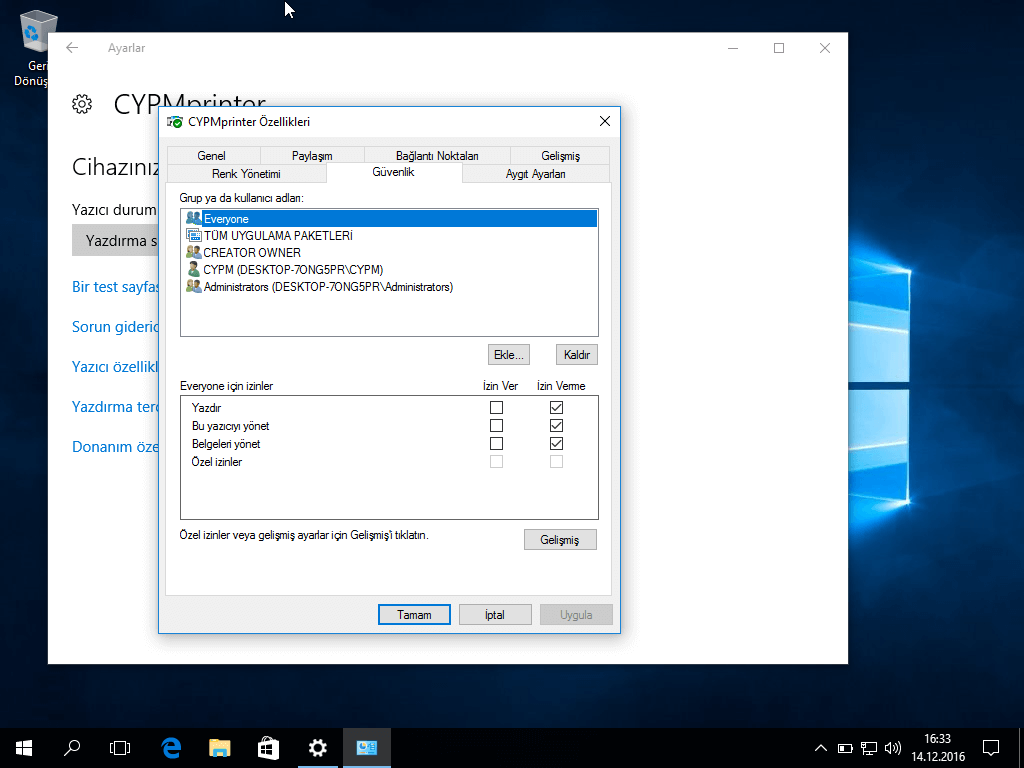 - Kullanıcılara yazdırma iznini atarken, Varsayılan olarak herkese yazdırma izni verilir. Bunu önlemek için yazıcılardan “Everyone” grubuna verilen izni kaldırın.