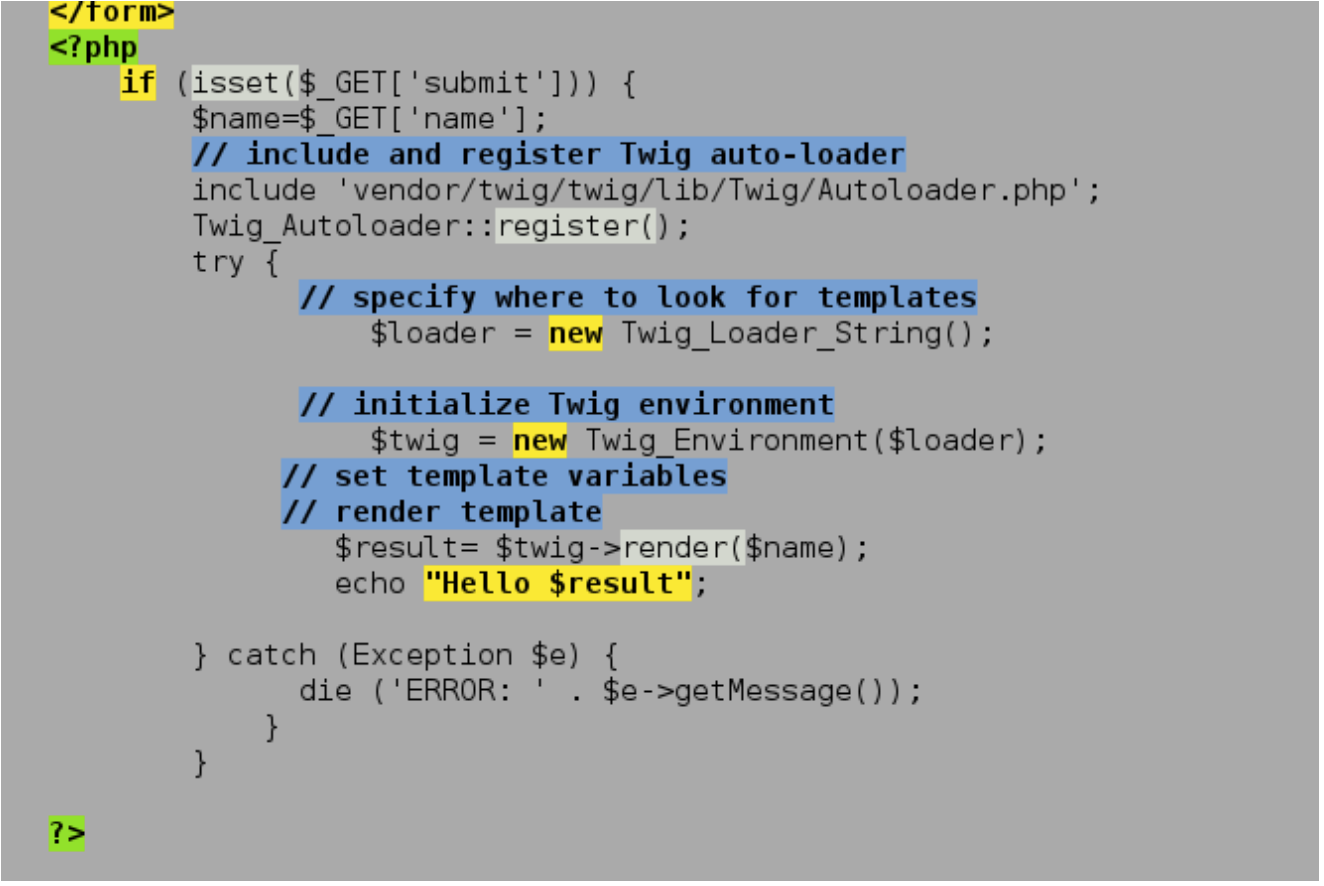 Twig, PHP dilinde kullanılan popüler şablon motorlarından birisidir. Smarty’nin güvenli moduna benzer diyebiliriz, statik yöntemleri çağırmak mümkün değildir. Twig’in kendi (_self) nesnesi vardır bu nedenle