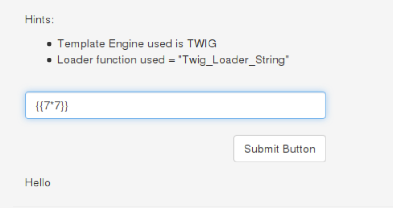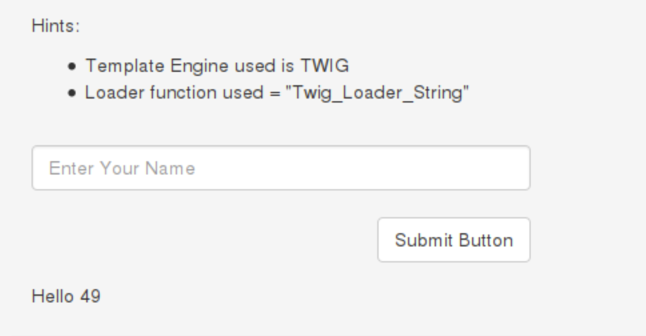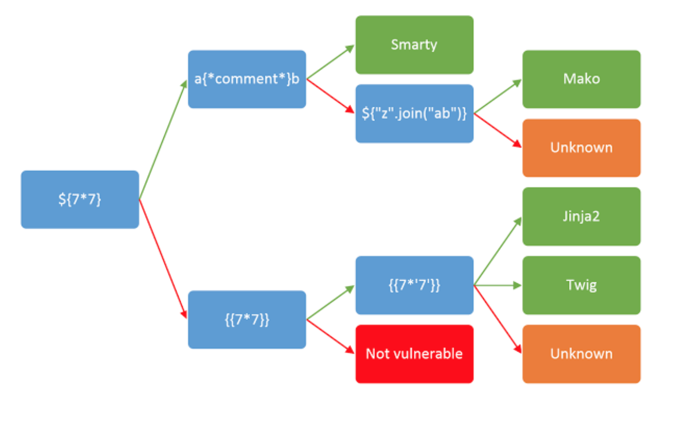 Örneğin; {{7*7}} girdisi Twig’de 49 olarak çıktı verirken, Jinja2’de 7777777 şeklinde bir çıktı vermektedir. Bu şekilde tanımlama için kullanılabilecek örnek girdiler ve çıkaracağımız sonuç şablonu aşağıdaki gibidir.