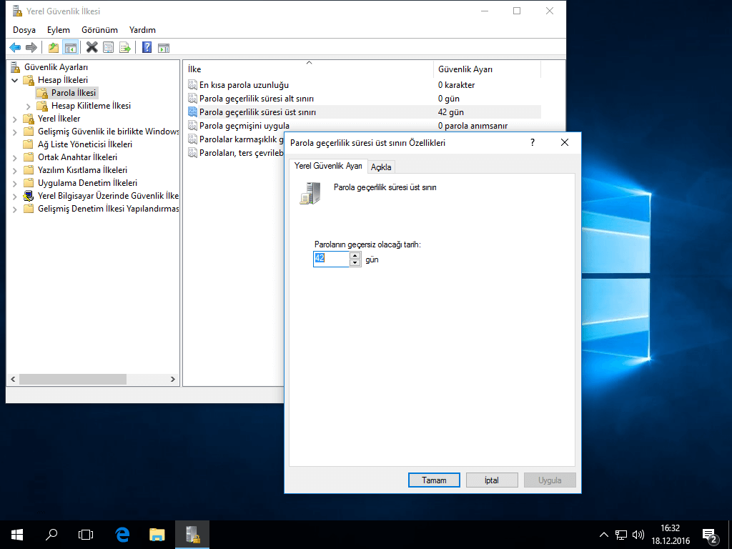 Parola her zaman geçerli olsun kutucuğundaki onayı kaldırıp ayarımızı kaydediyoruz. Artık kullanıcı hesabımız Windows’ta varsayılan olarak 42 gün ayarlı olduğu için 42 gün sonunda bizden parolamımızı değiştirmemizi isteyecek. Dilersek zaman aşımı gün ayarlamasını da yapabiliriz. Bunun için de: Çalıştır ‘a secpol.msc yazarak Yerel Güvenlik İlkesi ayarlarına erişiyoruz. Hesap İlkeleri-> Parola İlkesi-> Parola Geçerlilik Üst Sınırı yolunu izleyerek parolamızın geçerliliğini yitireceği günü belirliyoruz. Parola sürelerinin ortamınıza bağlı olarak 30-90 gün arasında dolmasının sağlanması en iyi güvenlik uygulamasıdır. Böylece, saldırganın kullanıcının parolasını ele geçirmek için sınırsız bir süresi olmayacaktır.