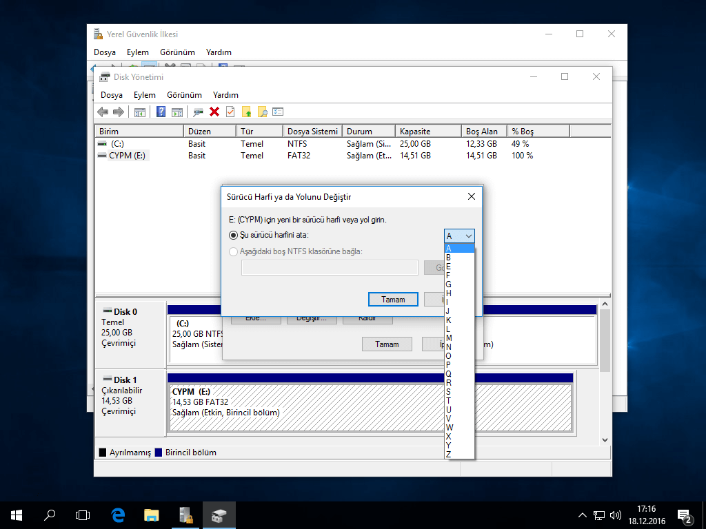 - Disk yönetiminden USB belleğimizin harfini A olarak değiştiriyoruz.